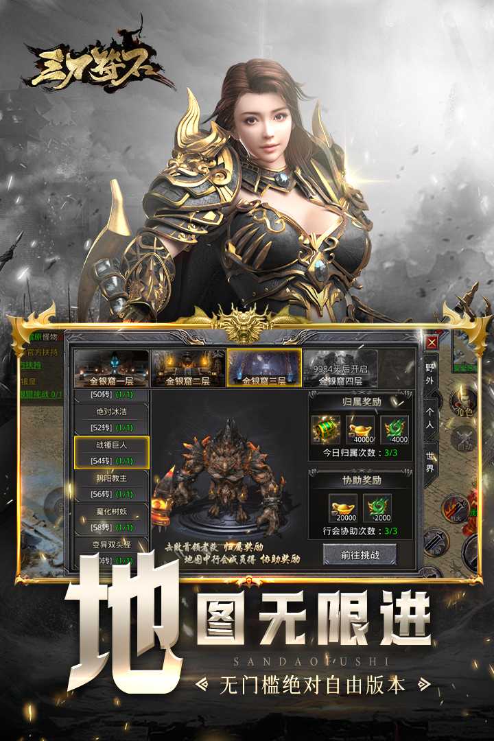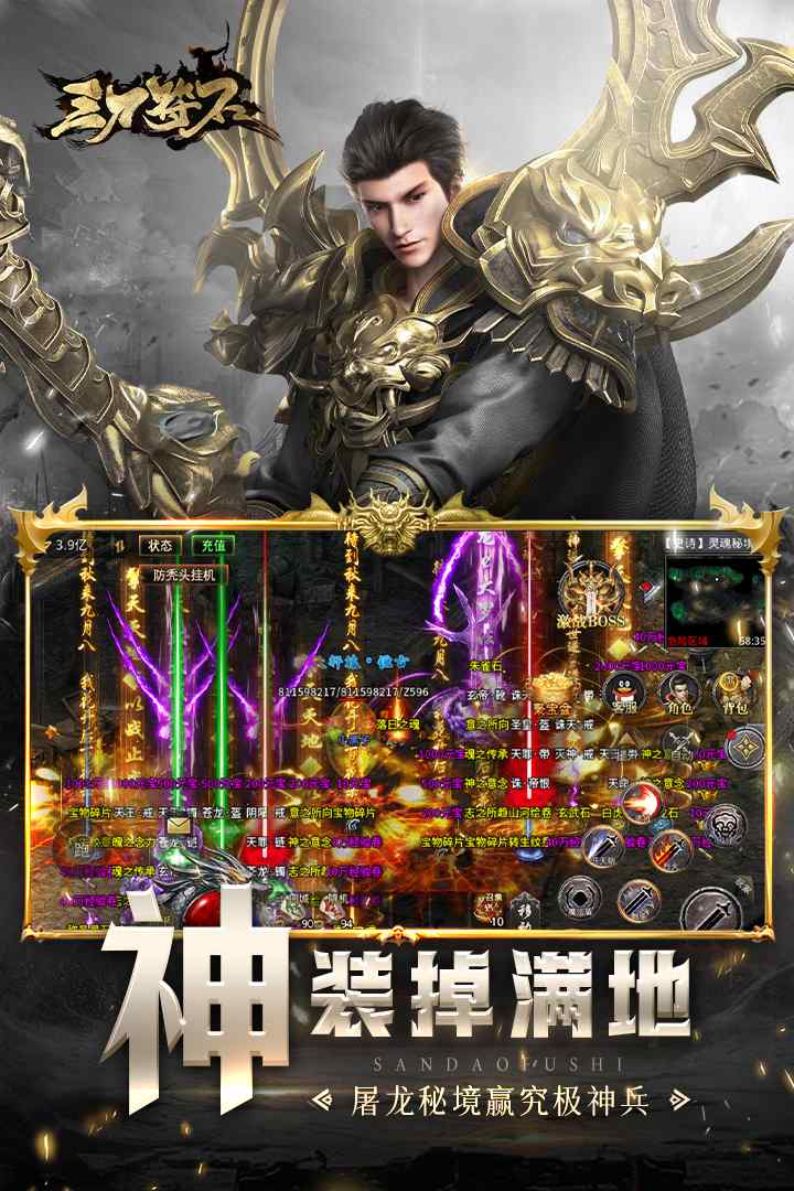 热血传奇游戏《三刀符石》,复刻经典端游趣味1.76版ARPG手游!全新2D渲染的高清画面带给你不一样的视觉体验!好兄弟相热血攻沙,原创热门冰雪玩法,开局一把刀,装备等你来打!