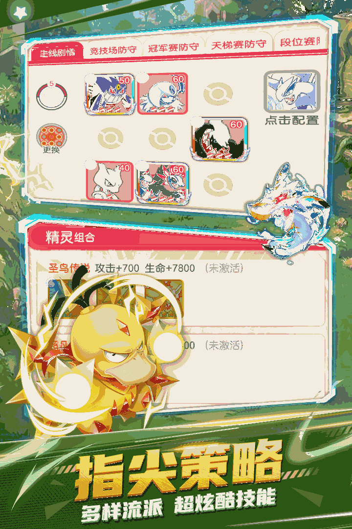 就决定是你了!开局赠送皮卡丘、喷火龙、妙蛙种子等经典强力五星精灵!拥有近二百只精灵形态待解锁收集。强力装备系统,多系多职业精灵养成,天赋宝石自由搭配,高自由度组成属于你的最强阵容!竞技场中同台竞技;公会战内巅峰对决;跨服天梯争夺最强,超多玩法等待一一体验。小精灵与你一路相伴!