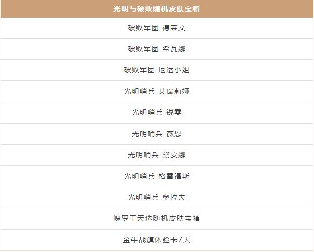 其中,光明与破败随机皮肤宝箱包含了光明哨兵&破败军团系列皮肤9款,全新的3款光明哨兵系列皮肤也在其中。具体奖励内容如下: