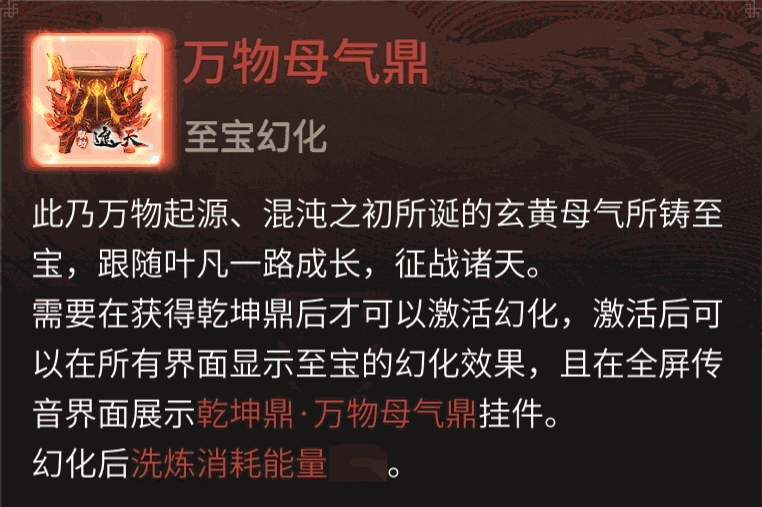 万物母气鼎蕴含的玄黄母气为炼器圣物,化作乾坤鼎的至宝皮肤后,可让洗炼所耗能量降低10%,提高效率,助仙友获得强力装备!