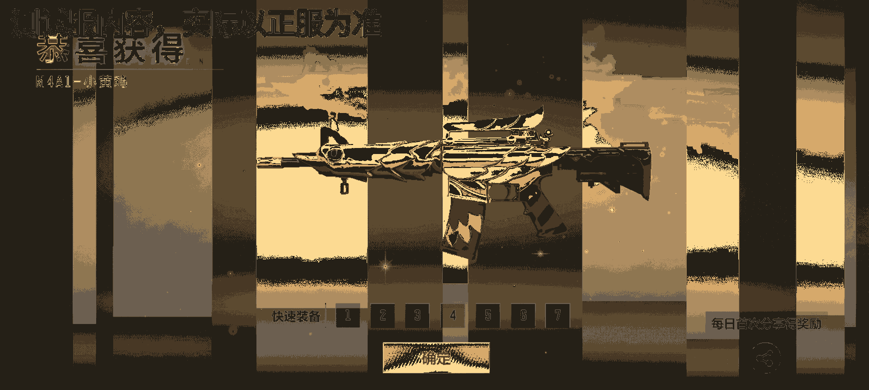 刻画着鸡外形的M4A1,装蛋时会出现鸡蛋,不确定不能不能吃。这款武器是一把紫色级别的武器,整体外观则是以鸡为原型,枪口则是鸡头,以及顶了一个红色的鸡冠。枪的瞄准器则是以鸡的翅膀为原型,并且在尾部加装了一个会来回旋转的小黄鸡,整体而言这把武器的趣味性完全拉满了。