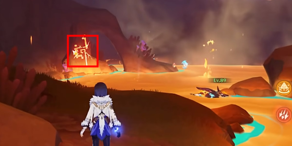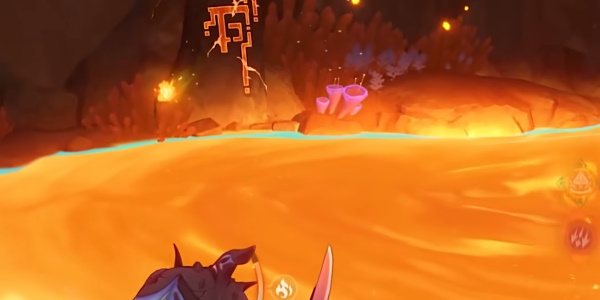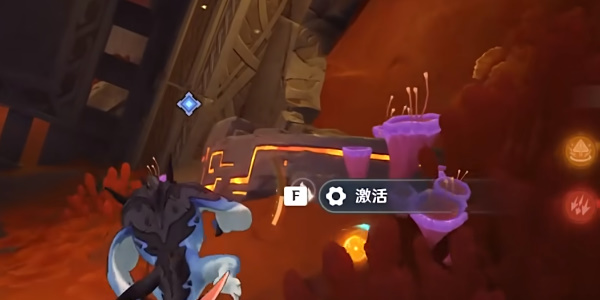 4、穿过铁门,调查熔浆池中的装置,然后变身为鳍游龙寻找2处揭露文,找到揭露文后返回熔浆池中的装置旁。