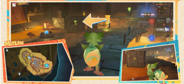 2、附身匿草龙,顺着管道前进,来到下图这个位置(触发剧情),吸取岩浆里的球,发射到铁门前的底座上,就可以开启铁门。