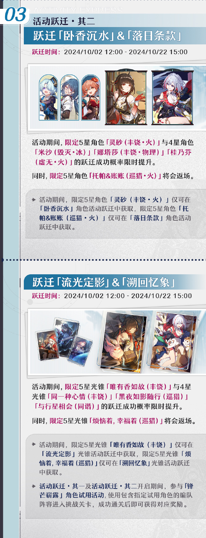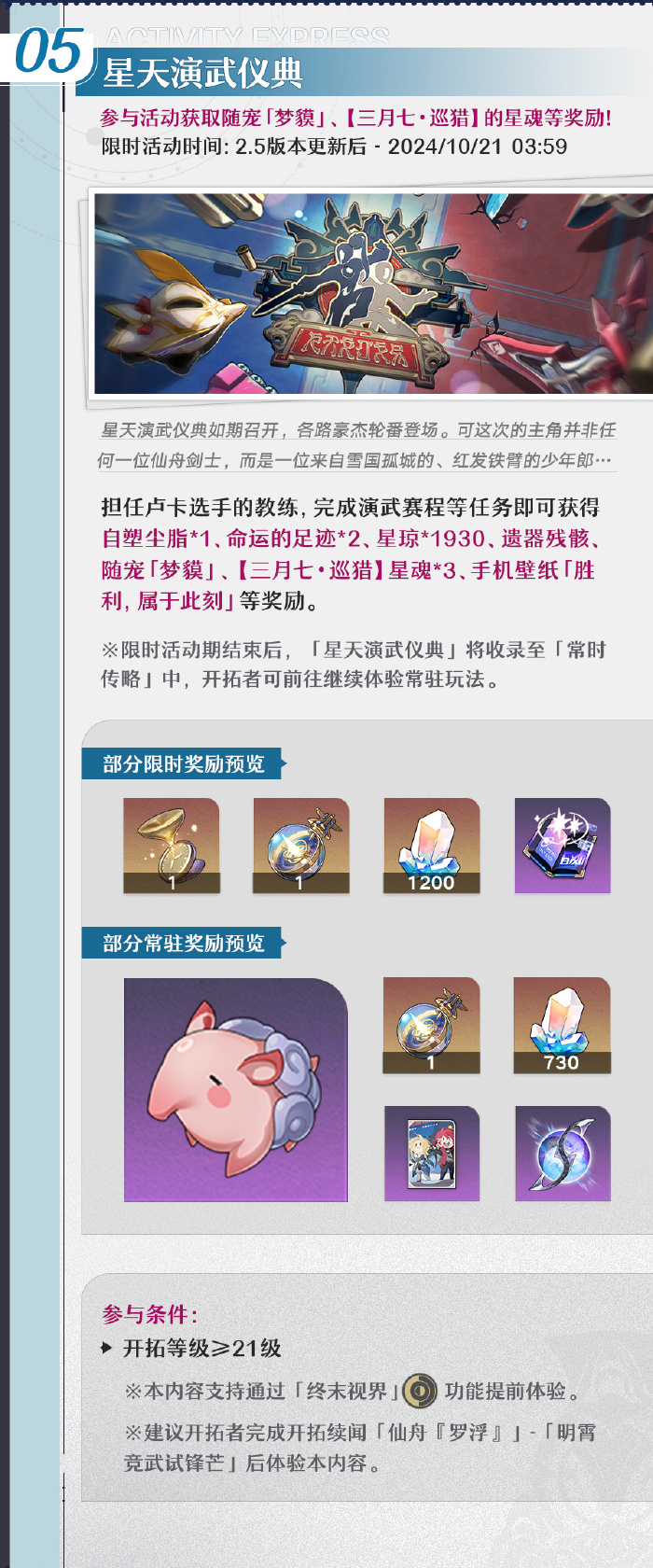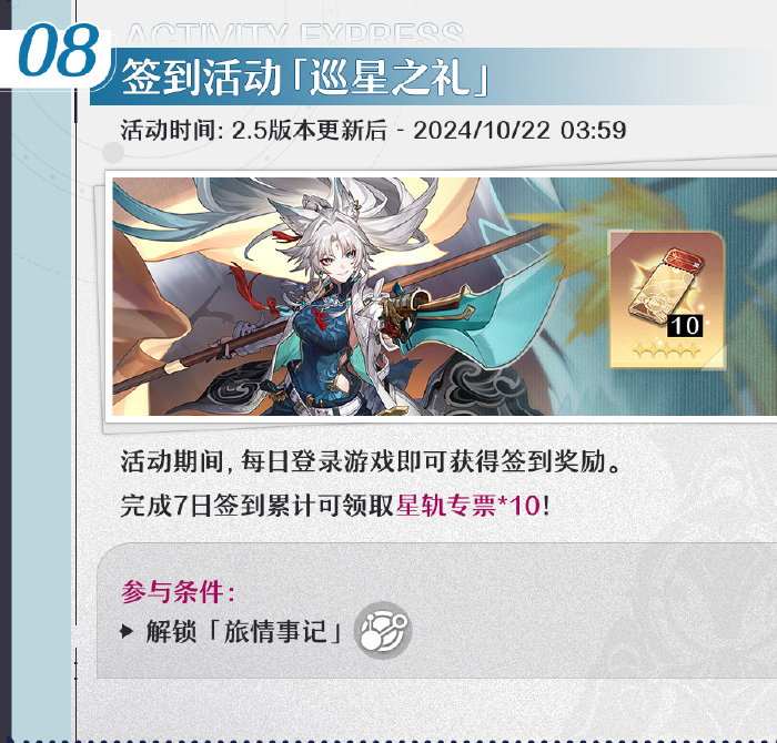 崩坏星穹铁道2.5版本有什么活动?崩坏星穹铁道2.5新版本将在9月10日更新后正式上线。此次更新不仅意味着将会有新的游戏内容、新的游戏特性以及可能的新角色加入,新版本上线通常会伴随着一系列的登录奖励活动,通过这类活动,玩家只需在特定的时间段内登录游戏,即可领取丰厚的奖励,下面将详细介绍本次新版本中包含的各项活动。