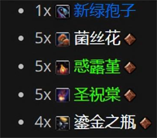 4、随后收集1个新绿孢子、5个菌丝花、5个惑露堇、5个圣祝棠和4个鎏金之瓶即可通过炼金制作。