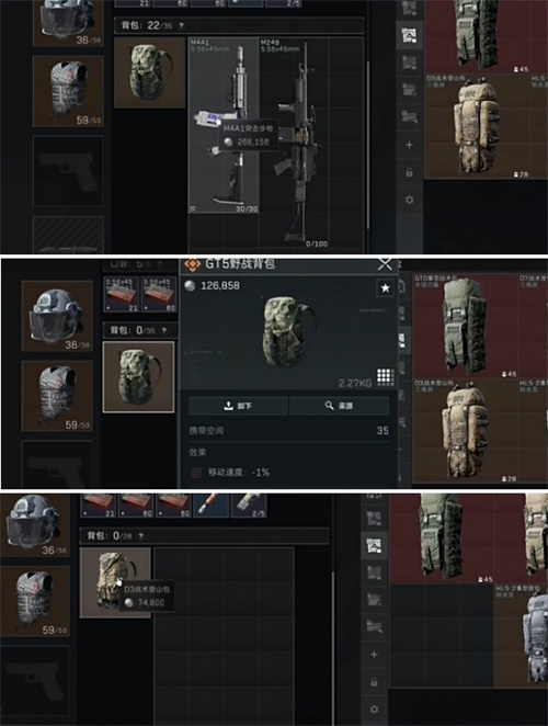 2、GT5野战背包:移动速度衰减是1%,35格背包空间。
