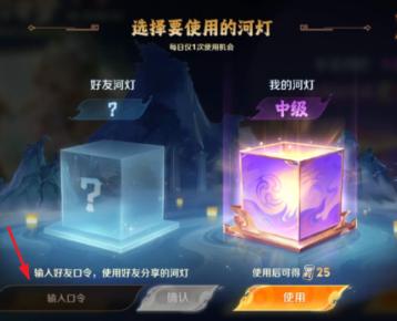 p1点右下角使用河灯,p2左边输入口令,点确定!!点确定!!点确定!!(重要的事情说三遍)然后再点使用,就可以使用别人的码了。