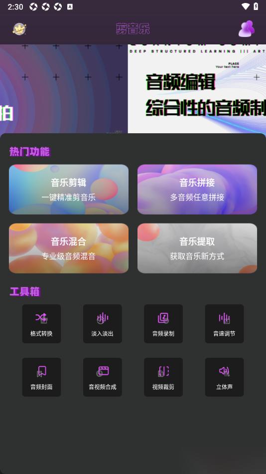 音乐剪辑全能王app这款软件可能有部分用户是有了解过的,大家在操作该软件的过程中,可以进行格式转换、剪辑音频等,还可以在该软件中进行音频录制,有的用户想要将一些视频中的声音或者是自己的说话声等录制下来保存和剪辑,那么用户可以直接在该软件中找到音频录制功能来操作,该功能操作起来非常的简单,无任何的手法,此外用户还可以根据需求设置音乐剪辑、音乐拼接、音乐混合以及音乐提取等相关功能,具体的教程方法已经整理如下,需要的用户可以来看看下方的步骤教程。