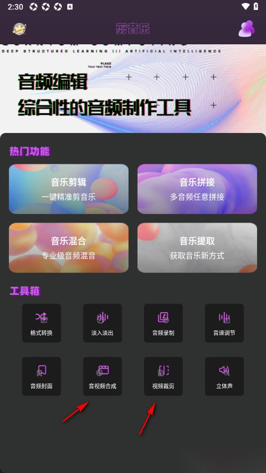 4.此外用户还可以在首页面上设置【音视频合成】【视频裁剪】等功能,如图所示。