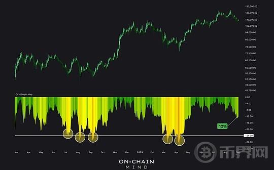 绿色成本带目前位于87,000 美元左右的底部(有趣的是,这相当是30%的历史最高回撤),标志着最高风险/回报累积区域。虽然市场可能会在这个水平附近徘徊数月,但通常在最后一波抛售结束后,会迎来进一步的上涨势头。