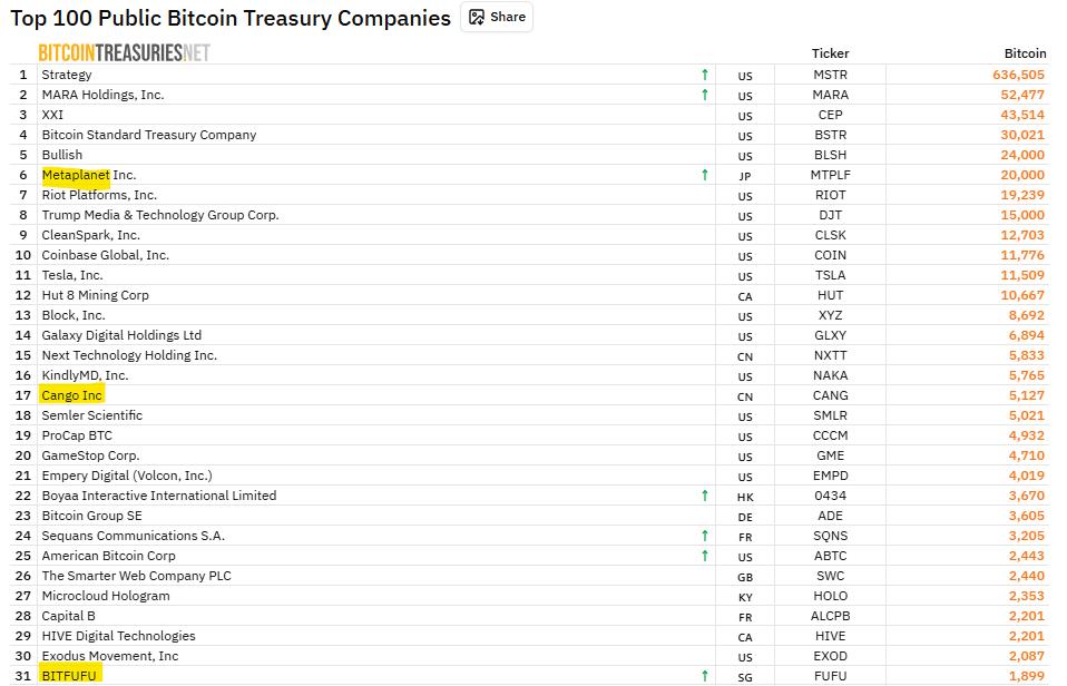 顶级公共比特币财务公司(:BitcoinTreasuries.NET)