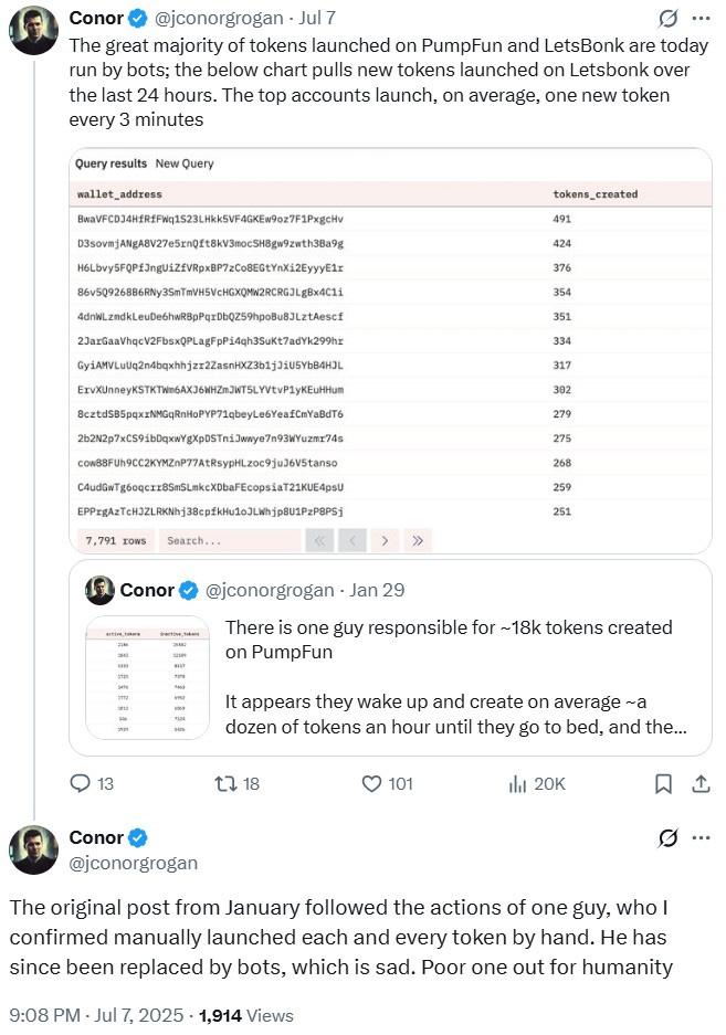 据Coinbase产品负责人Conor Grogan表示,在Pump.fun和LetsBonk上发行的代币很可能主要由机器人操作。