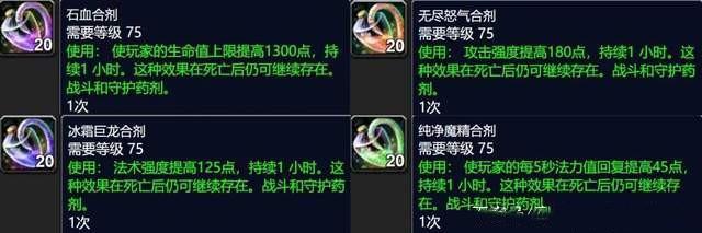 80级版本药剂仍有1战斗药剂+1守护药剂的限制,而且由于80级新药剂效果太差,因此在绝大多数PVE场合玩家都会使用合剂。80级PVE合剂包括生命值上限、攻强、法强和回蓝4种,持续时间由2小时变为1小时,炼金术专业技能达到50点以上的玩家持续时间加倍且能获得30%左右的额外属性收益。此外60和70级合剂持续时间也降低为为1小时,这些改变将在前夕版本开放后生效。