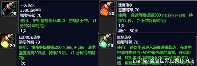 80级常规PVE药水几乎都是70级的升级版,由于物理和法师急速属性统一,法系玩家也可以喝急速药水了。80级关于药水的最大变化是战斗中只能使用一瓶药水,也就是说DPS职业战斗中只能喝1瓶爆发药水,治疗也只能喝1瓶大蓝,这也使得TBC治疗神器炼金石收益大幅降低彻底沦为鸡肋饰品。前夕版本开放后玩家需要掌握一项全新的PVE操作技巧——偷药水,即坦克和DPS职业在进入战斗前提前喝下1瓶药水,这样CD转好后还能喝第二瓶,偷药水时间卡得越极限收益越高。治疗玩家则可以在合适的时间使用噩梦药水以获得比大蓝更高的魔法恢复。