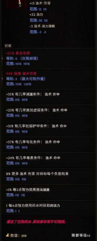 3、智力属性是主堆属性,100+智力配合符文以及法师的被动带来非常多的额外属性加成,冰川有基础暴击率节点,保证副手水晶头骨的基础暴击roll值后,后期不需要装备拿暴击率词缀即可满暴击非常香,寒冰弹幕也有额外暴击率节点,也能至少80%+暴击率。堆智力可以拿暴击率、冷却时间、施法速度、护盾保留、inc增伤、护盾秒回 非常划算,属性流中完美适配的存在~