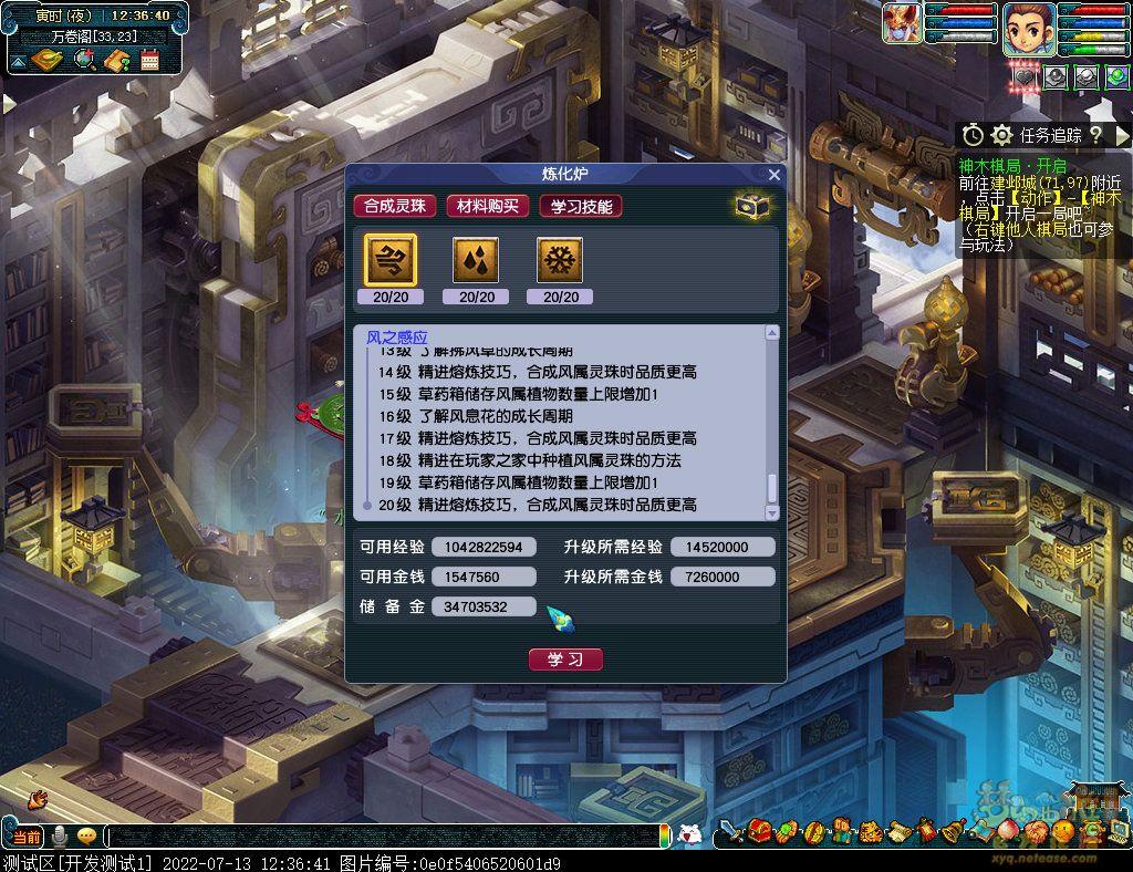 技能学习可以通过天机城万卷阁的炼化炉学习,也可以通过有天气地图莫忘的便携式炼化炉学习,花费一样,需要帮贡、经验和金钱。技能分为:风之感应、雨之感应和雪之感应。学习总共需要花费约1亿游戏币,技能上限20级,每级学习后有对应的效果和提升。