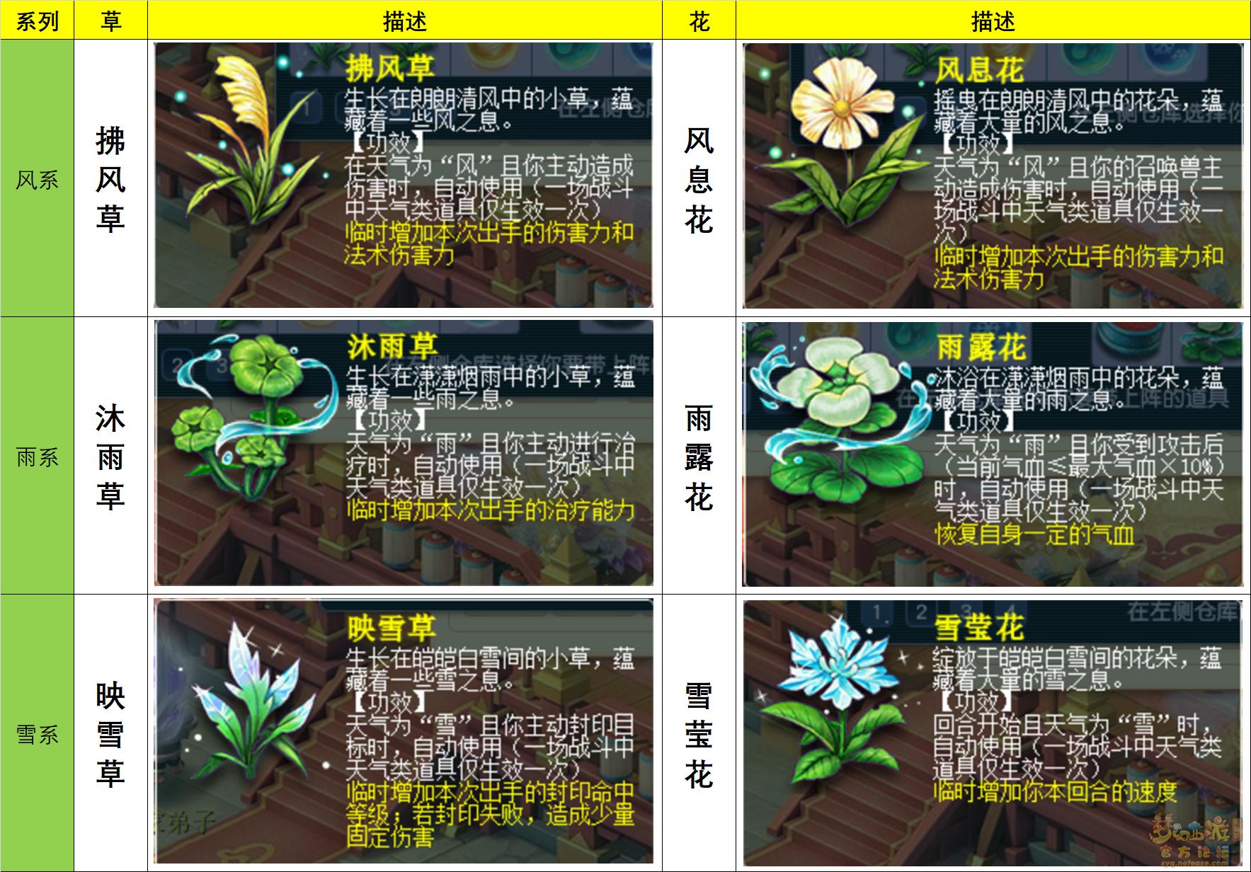 目前天气系统带来的草药总共有6种,每个天气系列两种。其中风系主要影响的是伤害,雨系主要影响的是(加)血量,雪系主要影响的是封印。草药的获得主要通过便携式炼化炉购买、场景地图采集和自己栽种。