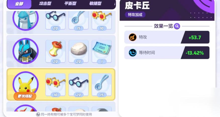 每个宝可梦都可以携带三件持有物,我们需要根据特点来进行添加,由于皮卡丘是特攻输出类,所以我们的持有物要最大化提高它的输出能力,优先推荐大家携带博识眼镜、穿透汤钥和讲究眼镜。