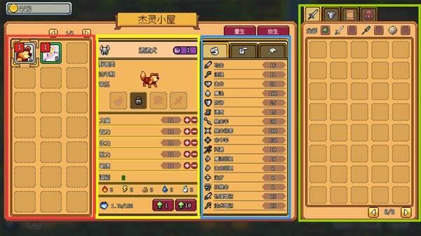 杰灵小屋是我们培养杰灵的页面,在这里能够查看到杰灵的所有信息,可以分为4个部分。