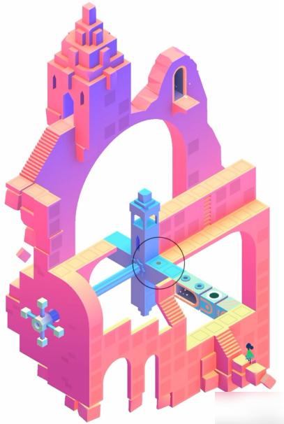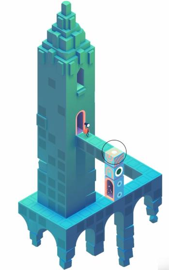 第三个场景的解谜需要先让角色进入方柱传送门,然后将方柱移动到特定位置。这样角色就能借助方柱到达蓝色固定柱