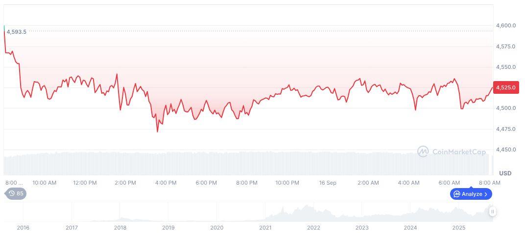 根据 CoinMarketCap 的数据,以太坊 (ETH) 的交易价格为 4,525.35 美元,市值达 5,462.3 亿美元,市场占有率为 13.49%。过去 90 天,ETH 飙升 79.88%,呈现出反映市场动态变化的增长趋势。