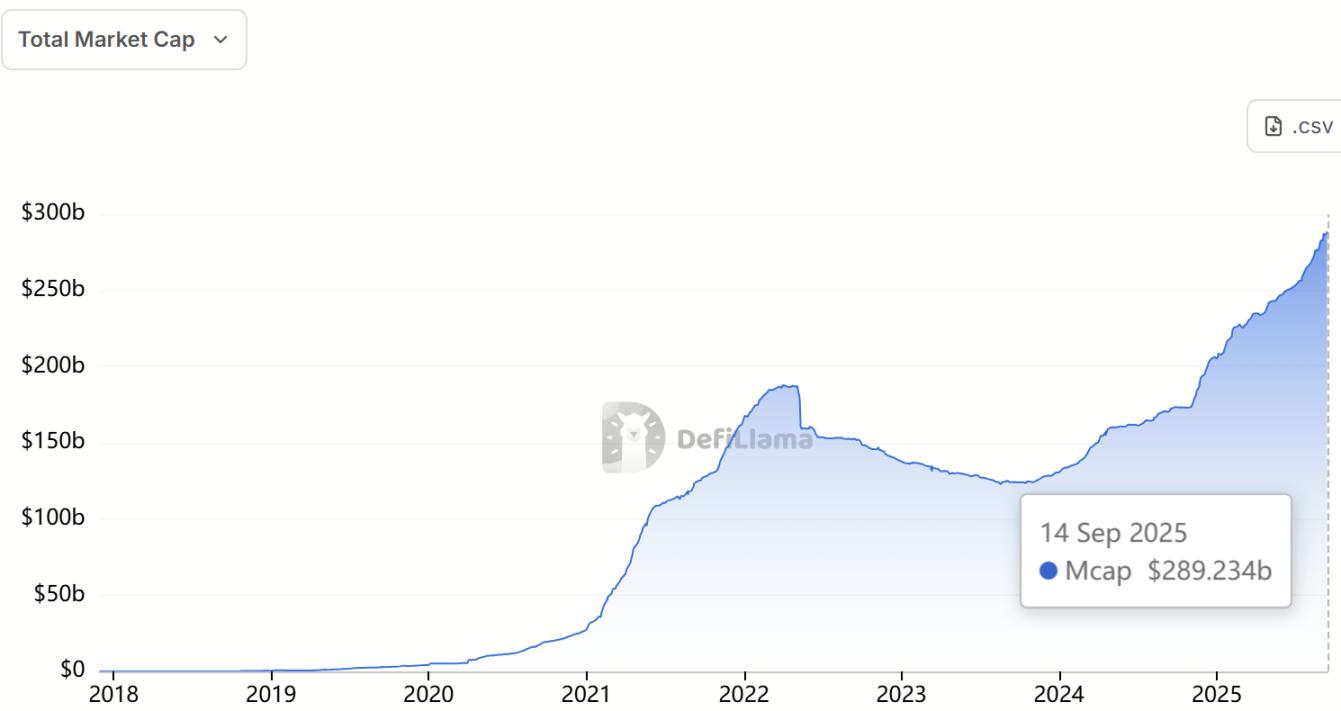 据 defiLlama 数据显示,截止 9 月 14 日,稳定币总市值约为 2892.34 亿美元,其中 USDT 占比为 58.96%,占据市场主导地位。
