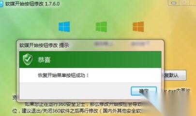 5、如需恢复系统默认开始菜单按钮,则点击“恢复默认”,恢复成功后弹出如图提示窗口。