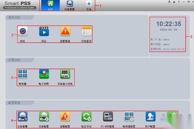 2.点击登录按钮之后可以进入到软件的主界面,其中主要的功能模块如下图中所示,我们找到配置管理模块中的设备管理这个选项,找到之后点击进去。