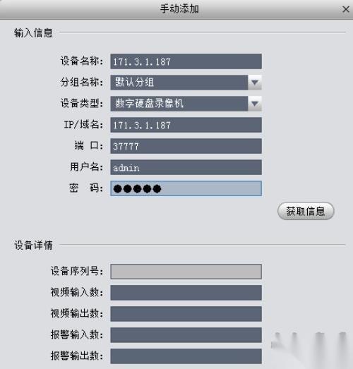 4.点击添加按钮之后,在出现的手动添加界面中,根据自己的需求来在其中输入想要添加的设备信息以及用户名和密码,点击下方的保存并添加按钮保存添加操作。