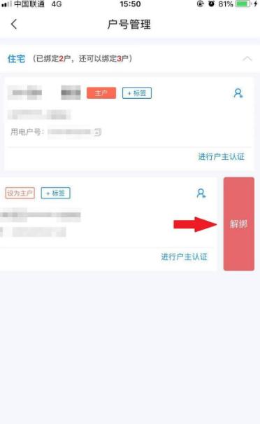 2、第一种方法:进入“户号管理”界面,在您需要解除绑定的户号上进行左滑操作,然后点击右侧出现的“解绑”按钮,然后在弹出的确认框中点击“是”按钮,即可成功解除与该户号的绑定关系。