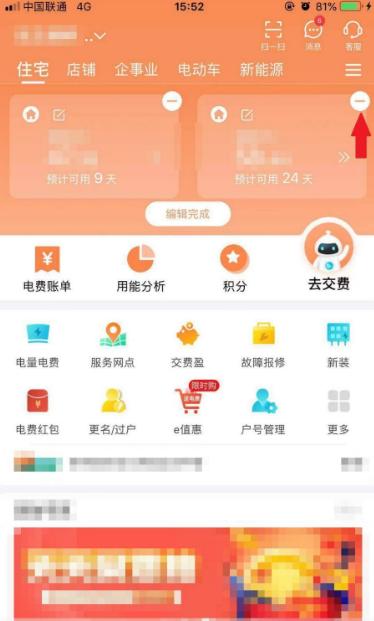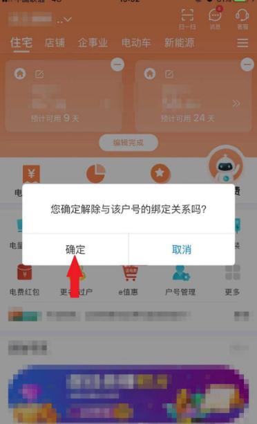 4、第二种方法:待该栏目进入编辑模式后,点击出现在需要解除绑定的户号右上角的“-”减号图标按钮,然后在弹出的确认框中点击“确定”按钮,即可成功解除与该户号的绑定关系。