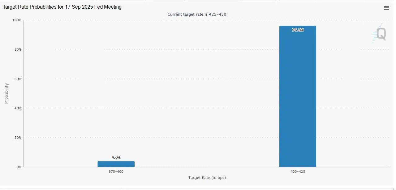 芝商所的 FedWatch 认为SEC 做出有利决定的可能性关于降息的比例为96%。