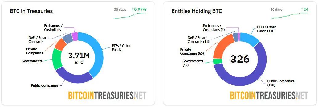 该策略目前持有 638,985 美元 BTC,价值接近 750 亿美元,使其成为全球最大的金库。然而,它并非唯一。目前,公共金库中共有 1,011,387 个 BTC,总计 371 万枚比特币,分散在多个持有机构中。根据比特币国库数据.