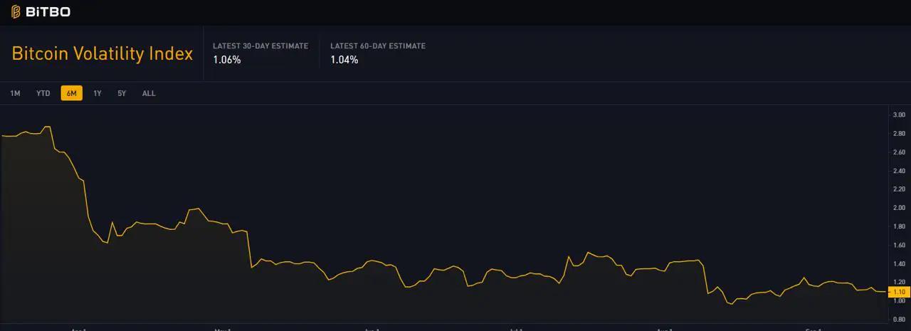 “>波动性在过去六个月呈螺旋式下降趋势后,目前处于历史低位。据BitBo报道,比特币的波动率在2025年5月降至1.5%以下,8月降至1.2%以下,此后一直稳定在此阈值以下。