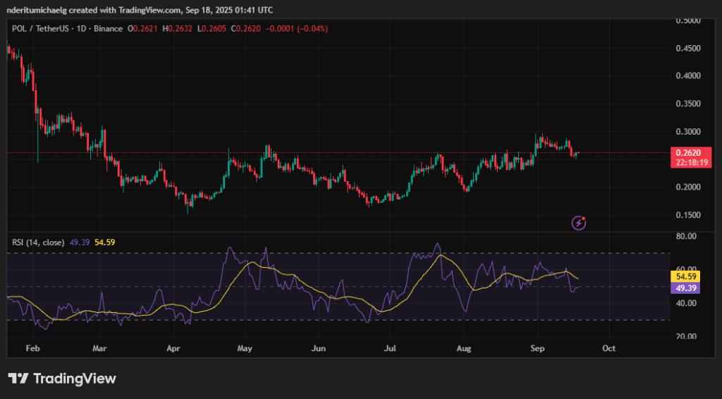 这证实了该代币已较其历史高点大幅折价。截至发稿时,POL 价格为 0.26 美元,这意味着其仍较其历史高点折价超过 70%。