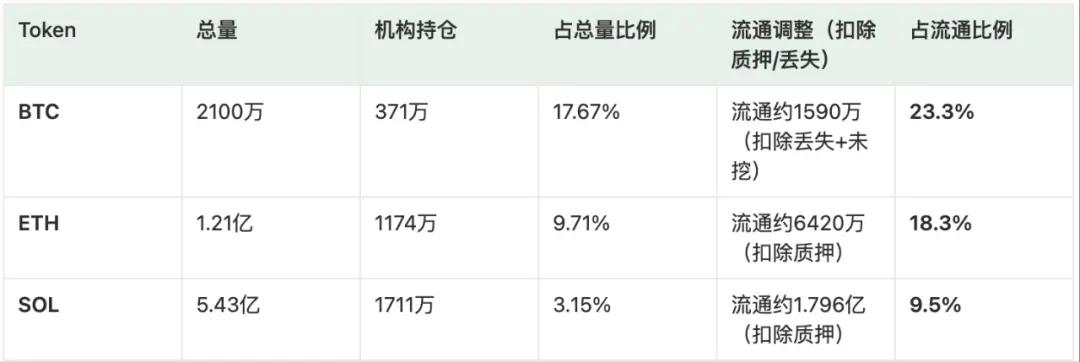 从对比可以看到:BTC、ETH的机构持仓占流通量 > 18%;SOL 目前仅 9.5%,可能存在补足空间。