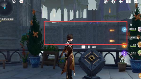 10.接着我们原路返回,爬上梯,一路往前走走上大平台,在平台上我们看到了这个方块机关,操作方块机关,将中间的高塔最长的那个手臂转动过来。
