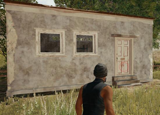 有些房子会有大窗户但很多都只有一个很小的窗户,大窗户是比较好扔进去的,但是小窗户就不是那么容易了。很多人会冒险选择去开门然后往里面扔手雷,这种有点经验的会在你开门的时候直接开枪打你了。高手们常用的方式是,先用枪在门的下方打出破洞,也就是上图红圈标示的地方。然后再拉手雷算好时间,往里面丢。这么做的优势是,你整个人一直在远距离的他没办法开门出来和你对枪,其次由于你一直在朝门打,敌人也不敢站在门附近往外扔手雷,很容易被子弹击倒。