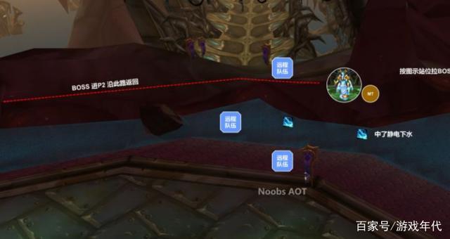 在积攒仇恨的过程中,猎人需要以下图“MT在这里来回移动”的方式进行风筝,这样Boss就会在柱子上来回移动寻路来找猎人。最后由防骑嘲讽Boss复制仇恨,然后按照同样的方式风筝Boss。