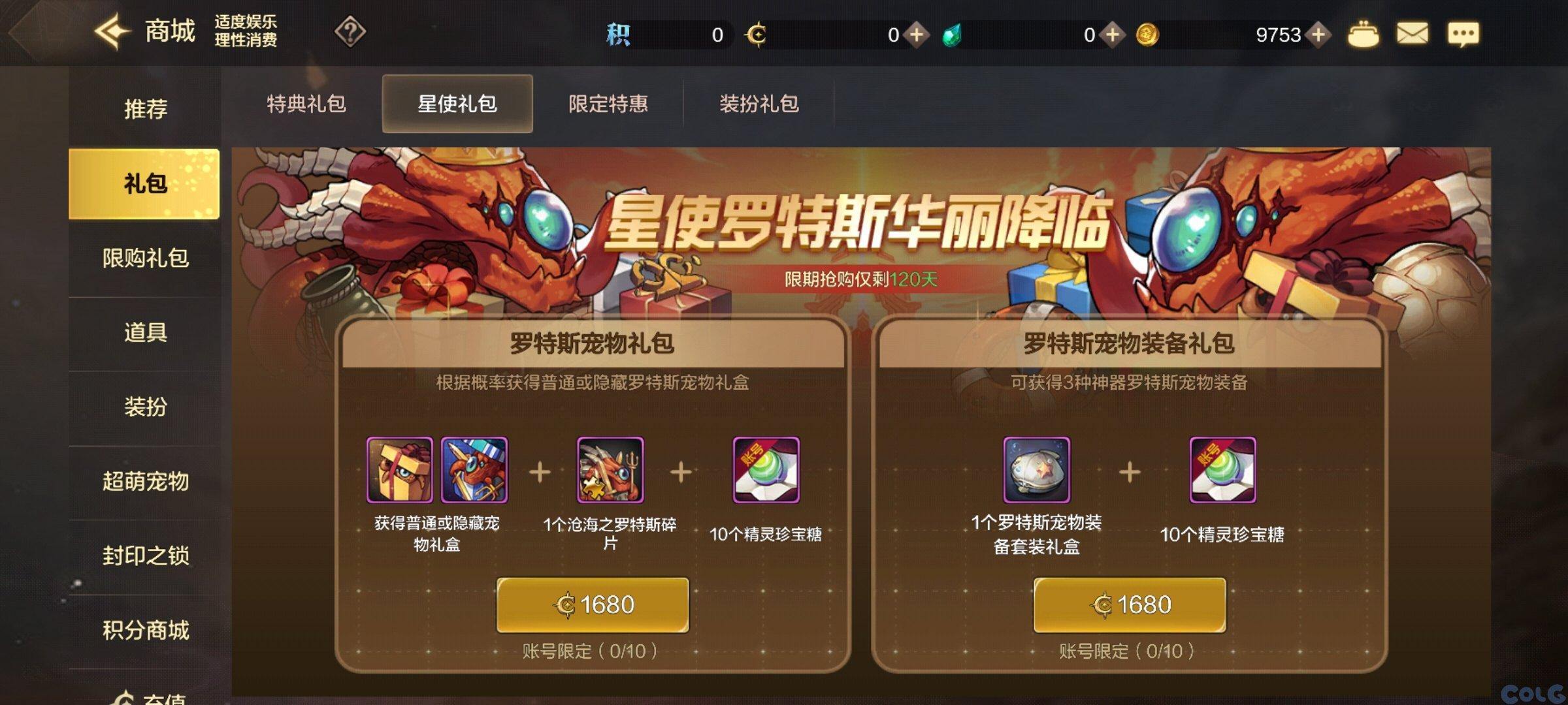 商城内限时上架宠物礼包与宠物装备礼包,售价均为1680点券。