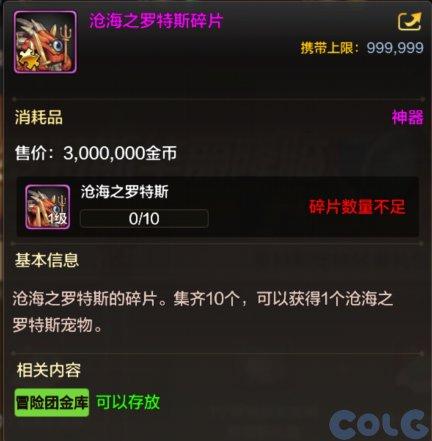 碎片可出售为300万金币,使用10个碎片也可合成1个沧海罗特斯。