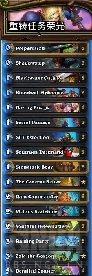 核心思路是加入黑水小刀和3费抽两个海盗和一个武器以增强过牌。任务通过回手1费血帆和2费群羊完成,通常可以在5费完成,胡的时候5费完成当回合就能用伺机待发跳奖励。打慢速靠船工小野猪和战术撤退斩杀,打快攻硬一手反复回收吸血,最后过山车一波压死。