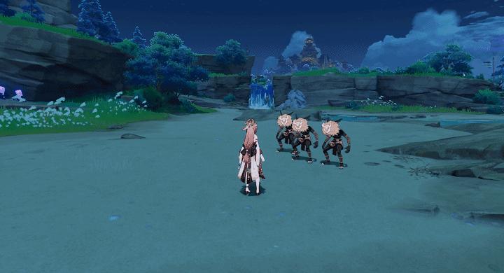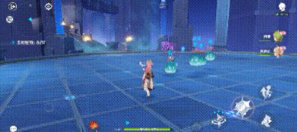 注意两个细节:(1)即使杀生樱改变攻击目标,仍然会继承攻击次数,并按次数产生元素微粒,(2)当场上只剩下1个怪物时,敌人承受两次攻击后跑出攻击范围,再跑回攻击范围,受到1次攻击即可产生1颗元素微粒。