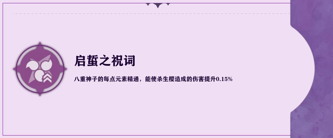 天赋分析:依据元素精通,提升杀生樱造成的伤害。提升杀生樱伤害最直接的方法,这个天赋也直接让元素精通对神子的作用性直接提升到与攻击力同级别。