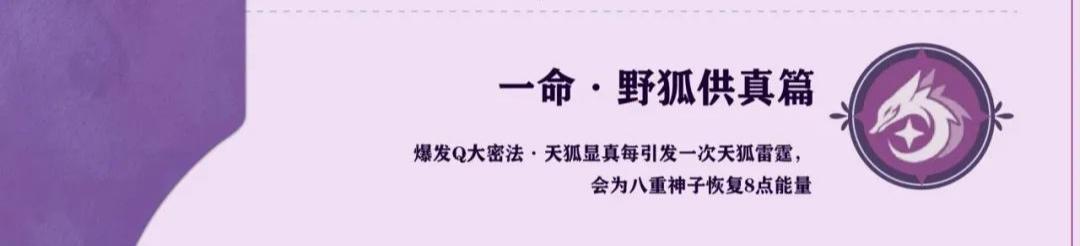 命座分析:一命为给神子提供额外的充能,八重神子的大招为90点能量,在22s的cd内仅靠八重自己是无法满足充能需求的,如果配合其他充能角色,在0命下神子还需额外的50%左右充能才能满足充能循环,但解锁1命之后不需要任何额外词条即可充满90能量。