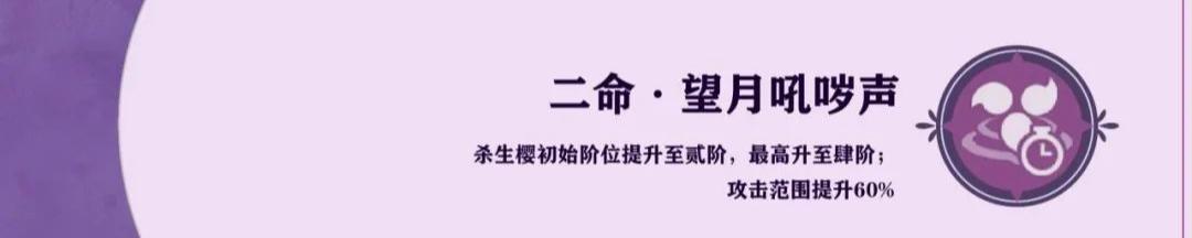 命座分析: 核心命座,在解锁2命之后,杀生樱的初始位阶提升为2阶,最高位阶为4阶。不看循环的话,单对元素战技来说提升在25%,但是在实战中达不到这么高的伤害提升。