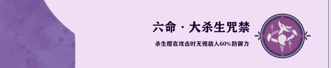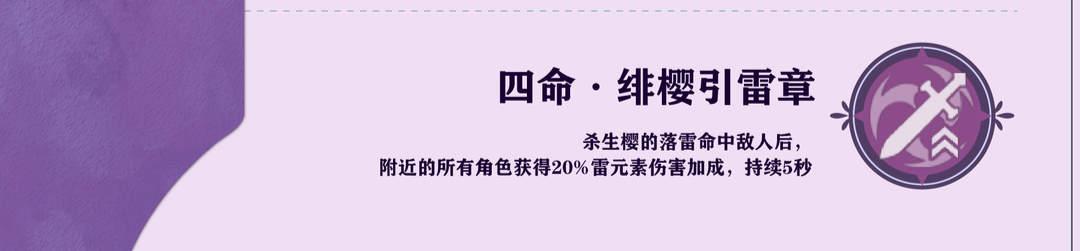 杀生樱:间歇性对周围的一名敌人降下落雷,造成雷元素伤害;附近存在其他的杀生樱时,将提升其位阶,提高上述攻击造成的伤害。