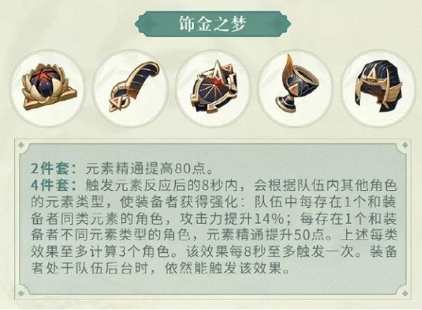 八重神子配合草系角色打激化反应是目前的最优配队,既然是打反应就需要元素精通,且八重本身具有精通转伤害的固有天赋【启蜇之祝词】,使每点精通提升杀生樱0.15%的伤害。这种具有精通转伤效果的C是不是很眼熟?须弥的赛诺、提纳里都具有精通转伤效果,所以才说八重是在考虑了须弥草反应后做出来的雷C,那么加精通与攻击的饰金套就很适合八重了。