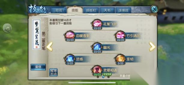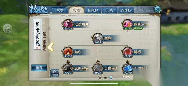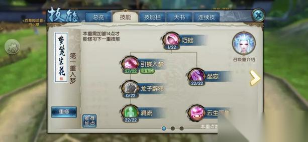 门派技能加点的核心在于平衡输出与生存能力。第一重技能中,坐忘和涓流需要点满以提升基础属性;第二重的花絮飞扬、血暖香繁、幽光等增益类技能同样需要优先加满;第三重则以画真入境和孔雀明王本体技能为重点。这种分配确保了召唤兽的持续作战能力,同时保留了足够的爆发潜力。竹引清风作为关键控制技能只需投入1点即可满足基本需求。