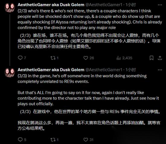 爆料人还指出,部分粉丝可能会对某些角色的缺席感到震惊,同时也会因其他角色的意外现身而惊喜。值得一提的是,克里斯·雷德菲尔德将不会出现在本作中。这一信息也得到了侧面印证——游戏总监中西晃史曾在科隆游戏展期间向GamesRadar透露,克里斯当前正在世界另一端执行任务,因此未参与此次事件。